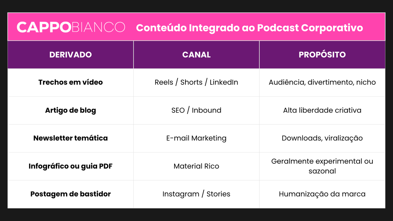 O podcast é a peça central de um ecossistema de conteúdo que se alimenta e retroalimenta. Cada episódio pode gerar múltiplos formatos: